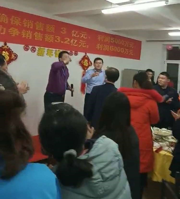 銷售部王云濤總,傾情提了四杯酒,敬董事長,敬自己,敬幕后人員。郝總代表大家為王總斟了一杯大酒,希望他2019年業(yè)績所向披靡,拿下5000萬目標(biāo)。他中招干了半杯,銷售酒量一般都是兩斤啊,神勇。后勤部王震山總勇猛做陪,一起炸了半杯。