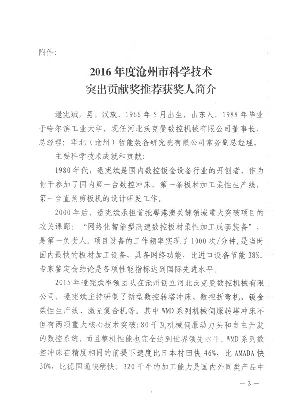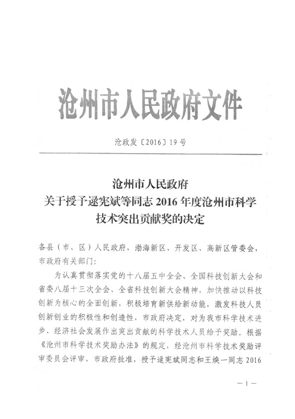 滄州市人民政府授予王煥一先生2016年科學(xué)技術(shù)突出貢獻(xiàn)獎